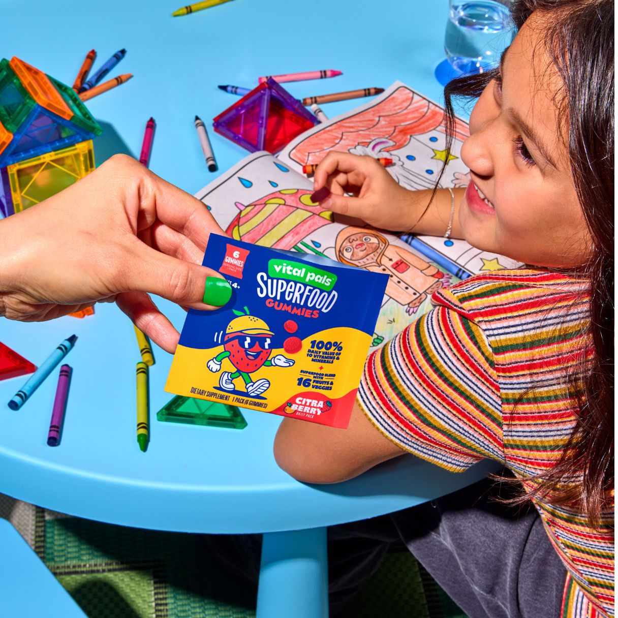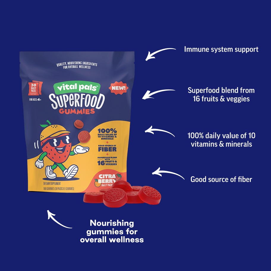 That’s where Vital Pals comes in. It’s the ultimate savvy-parent hack with nutrients, fiber and a superfood blend in a scrumptious once-daily gummy pack that kids actually ask for.