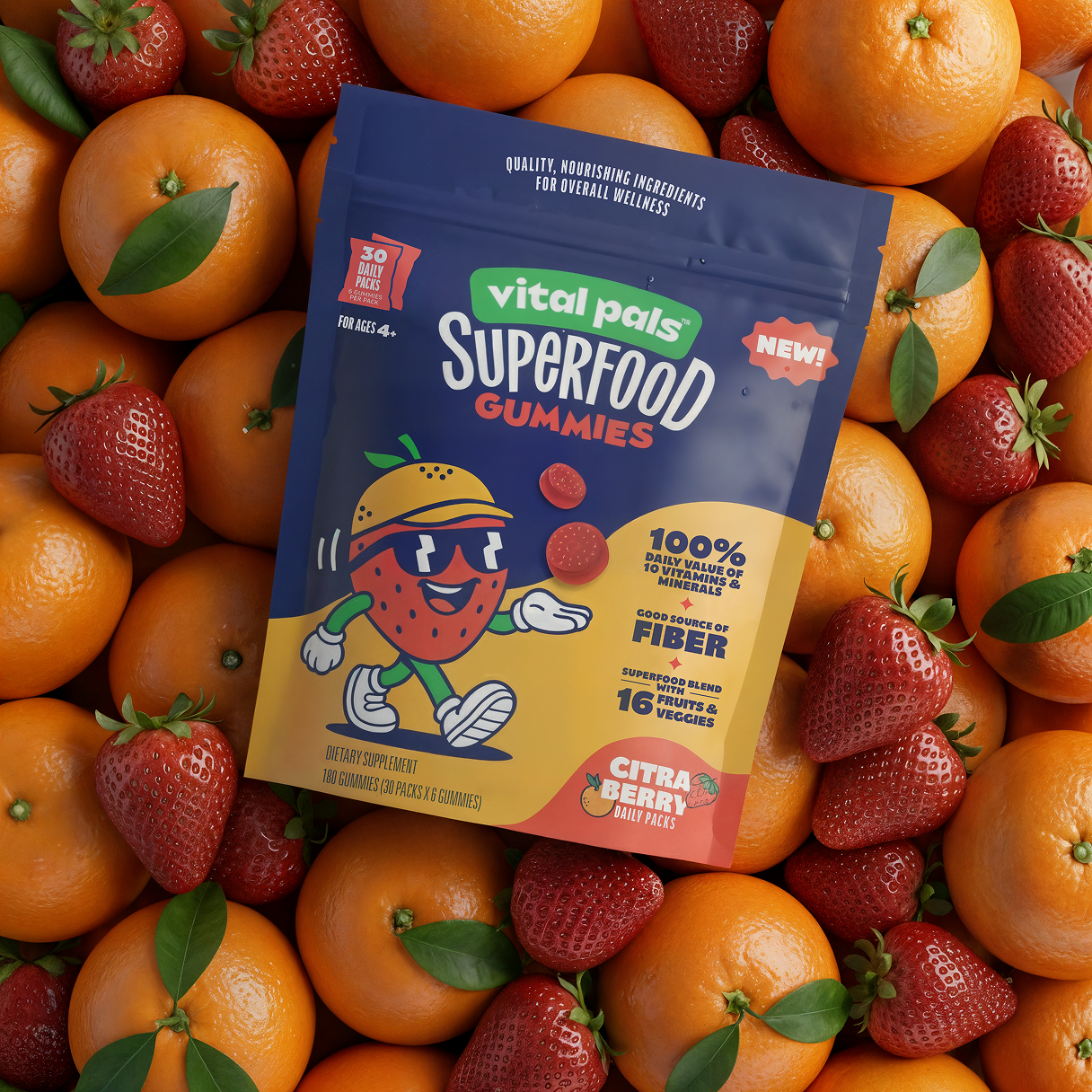 Perfectly pop-able and loaded with fruity flavor, Citra Berry gummies are pure sunshine in a snack. Each once-daily pack delivers 100% daily value of 10 key vitamins and minerals, as much soluble fiber as an apple, and a superfood blend from 16 fruits and veggies.